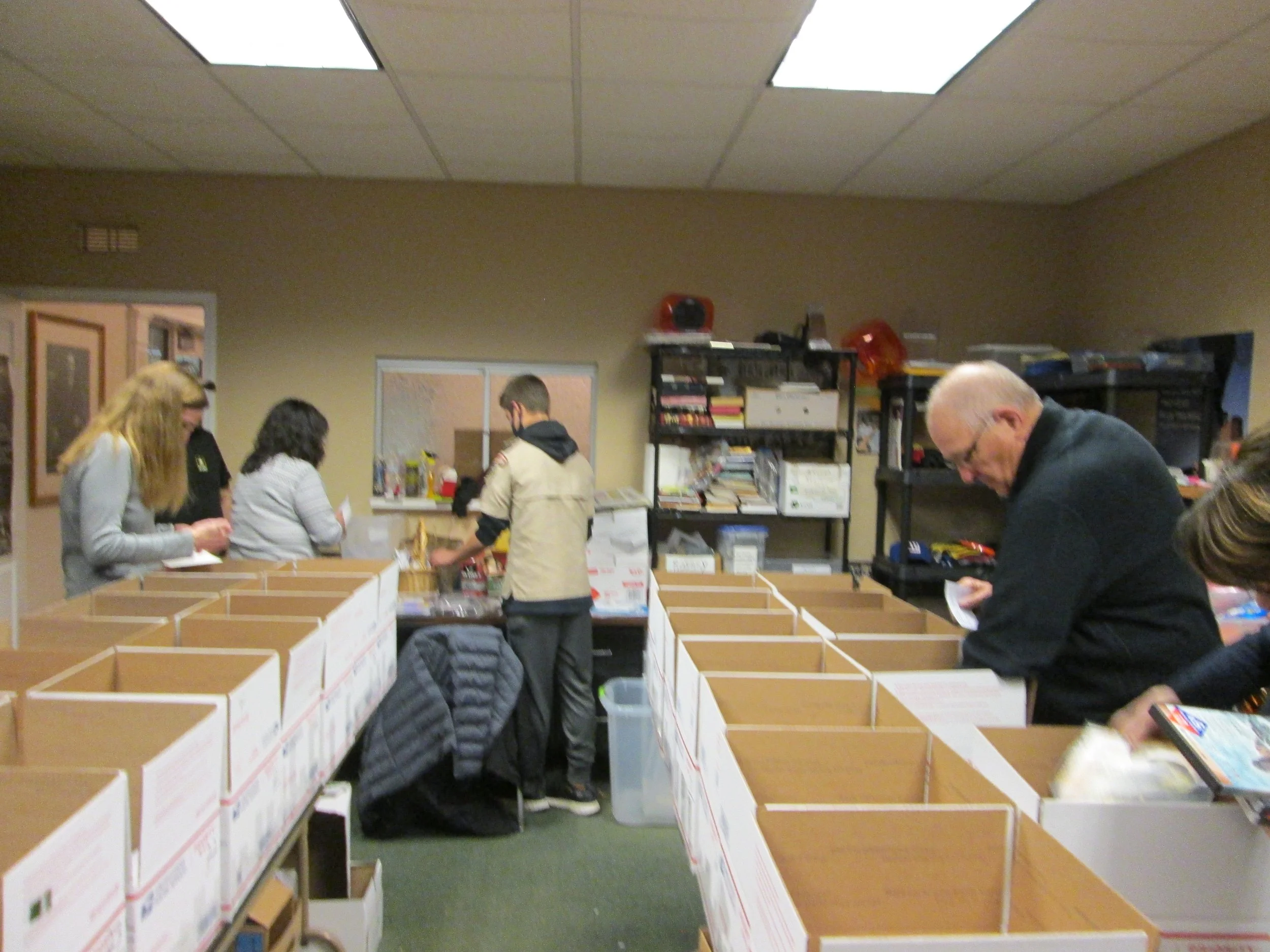 Volunteers filling the boxes at a Kruse’s Krew packing. night. An average packing night ends with 40 packages ready to go to troops around the world.