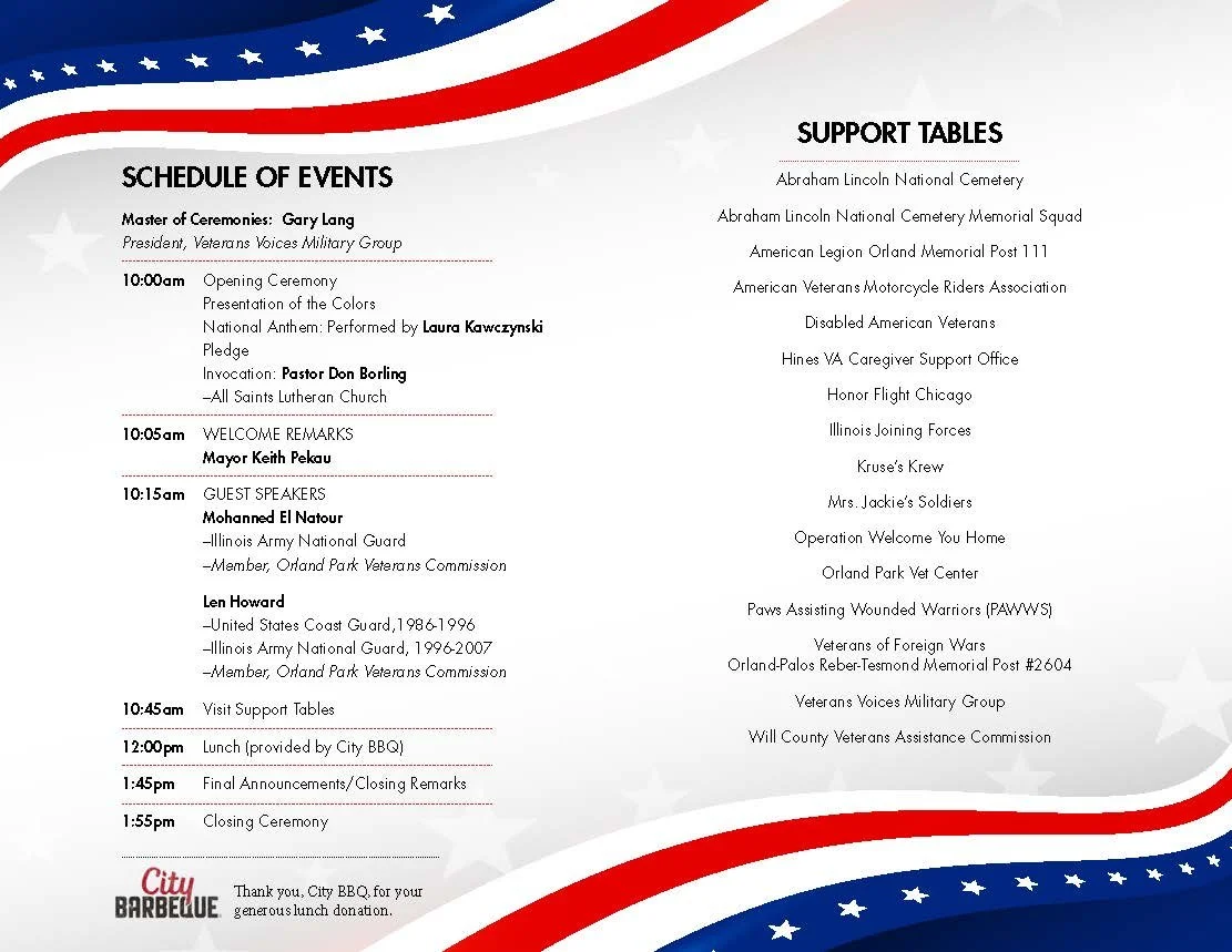 The Board of Directors of Veterans Voices Military Group is grateful for the support of the Village of Orland Park, the Orland Park Civic Center Staff, our members, our volunteers, and the participants for the efforts invested in making this event a success. Be assured, many members of our veteran community benefitted from our combined efforts.